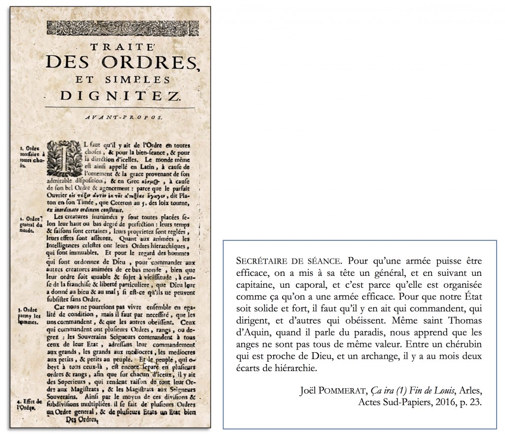 Quelques jours plus tôt, pour pénétrer la vision du monde des notables de l’assemblée de 1787 qui inspire les premières scènes du spectacle, j’avais sélectionné plusieurs textes concernant la société d’ordres et le caractère « naturel » de cette division selon certains. Cette hiérarchisation discriminatoire de la société étant bien antérieure à 1789, j’avais remonté le temps et découvert Le Traité des ordres et simples dignités de Charles Loyseau écrit en 1610. Joël Pommerat a attribué ce texte à Maxime Tshibangu le 13 août au moment où nous commencions à travailler sur le tiers et le district. Choisi pour alimenter un discours de noble, les arguments de Loyseau se retrouvaient finalement portés par un représentant du tiers. La conviction avec laquelle Maxime Tshibangu s’en est emparé, le style « prédicateur » qu’il a exploré et le choix du costume (notamment le nœud papillon) dessinaient une première silhouette de personnage que nous avons alors nommée entre nous « Monsieur Loyseau ». Débaptisé pour l’édition et renommé selon sa fonction de « secrétaire de séance », ce « Monsieur Loyseau », fervent défenseur de la monarchie tient aussi du Monsieur Loyal (proximité onomastique inconsciemment à l’œuvre pendant la répétition ?) dans la manière dont il cherche à canaliser et organiser la réunion ; fonction d’animation dont on retrouve une autre facette, exacerbée, lorsque le même comédien, Maxime Tshibangu, incarne un Homme au micro, chauffeur de salle pour l’arrivée du roi à Paris (scène 16).